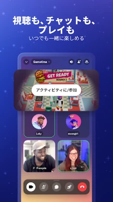 友人との交流はDiscordでかつてないほどスムーズに。招待や呼び出しの手間なく、音声通話やテキストチャットの部屋に気軽に出入りできます。誰がオンラインで、どのゲームを、どんなキャラクターでプレイしているかが一目瞭然。サポート対象のゲームであれば、Discordから直接フレンドのセッションに参加することも可能です。動画を一緒に視聴したり、Discordが提供するゲームを楽しんだり、音楽を聴き合ったりと、様々なアクティビティを共有できます。テキスト、音声、ビデオ、ゲームプレイ間のシームレスな切り替えで、会話の流れを途絶えさせません。