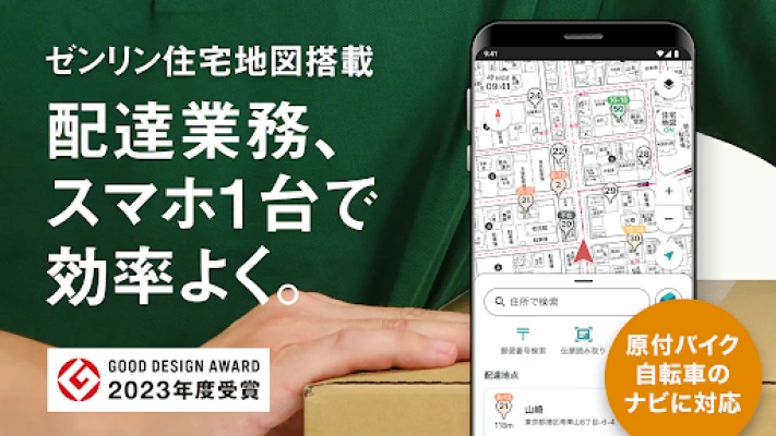 「配達NAVITIME ゼンリン住宅地図/荷物管理/カーナビ」は、配達ドライバー向けの革新的なアプリです。2023年度グッドデザイン賞受賞。ゼンリン住宅地図で建物名や表札を確認し、詳細ナビと荷物管理でラストワンマイル業務を効率化。誰でもベテランのように安心・確実な配達を実現します。
